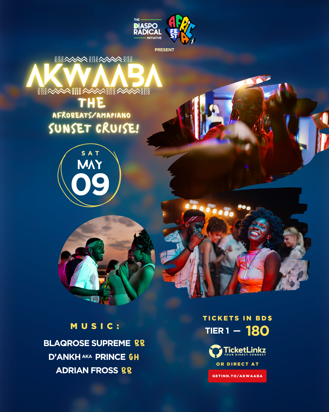 Join us aboard the Afro Sunset Cruise for an unforgettable evening of golden skies, ocean breeze, and pure cultural energy.